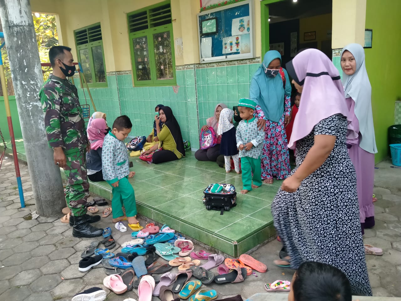 Babinsa Desa Tamansari disela kegiatan Pra TMMD sempatkan waktu sambangi KB Tabiratul Islam, selain anak-anak terlihat juga ibu-ibu yang sedang mengantar putra-putrinya. Sambil menunggu sambil bercengkrama dengan yang lain.