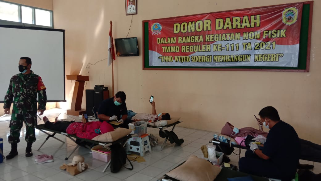 Kodim 0718/Pati bekerjasama dengan Palang Merah Indonesia (PMI) Cabang Pati dalam pelaksanaan TNI Manunggal Membangun Desa(TMMD) Reguler 111 TA.2021 yang dilaksanakan di desa Tamansari, Kecamatan Jaken, Kabupaten Pati, menyelenggarakan kegiatan Donor Darah kepada anggota Satgas TMMD, Pemerintah Desa dan warga yang ingin ikut serta mendonorkan darahnya.