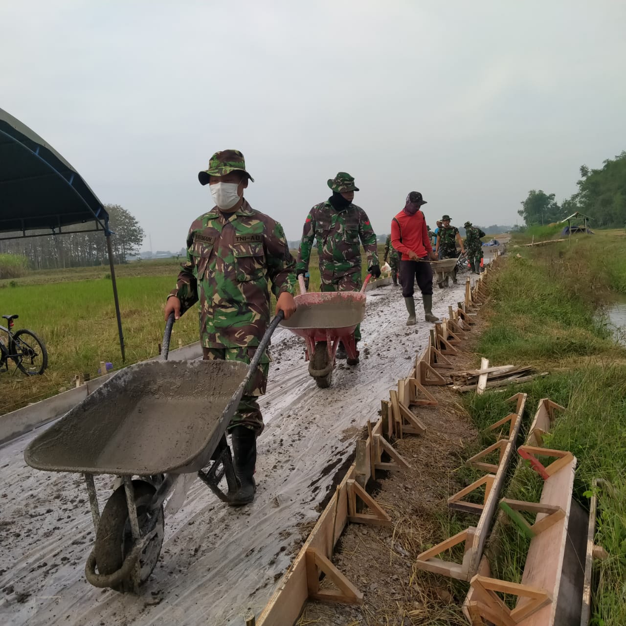 Terlihat dalam pantauan prajurit berbaju loreng dengan angkong andalannya secara antri dan penuh gurau, anggota TNI ini kembali dari menuangkan adukan material yang telah siap. Dan mereka pun kembali melangsir adukan material yang akan digunakan dalam pengecoran jalan dengan budaya antri.
