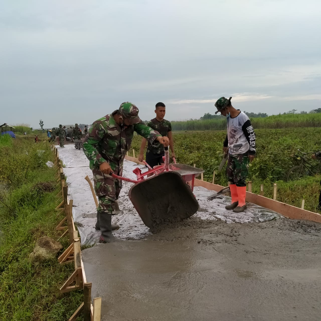 Sekelompok orang itu adalah Anggota TNI satuan tugas TMMD Reg-111 Kodim 0718/Pati dan warga yang sedang berjibaku dalam program Betonisasi jalan penghubung antar dua desa, Desa Tamansari dan Desa Sumberagung yang mana jalan tersebut memanjang melewati persawahan.