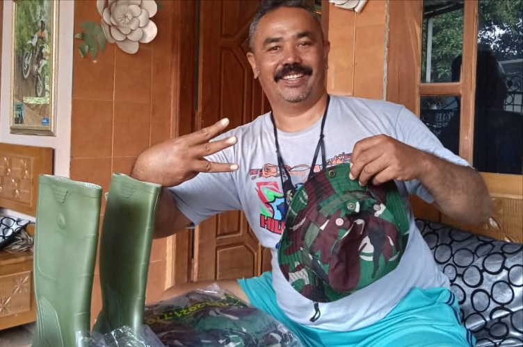 Terlihat Sertu Sukiman tengah duduk di teras rumah biasa ia beristirahat selama bertugas sebagai anggota Satgas. Dengan bangganya memamerkan kaporlap yang baru saja diterimanya, berupa Satu setel sepatu boots, satu buah PDL loreng, koas loreng dan satu buah topi rimba,