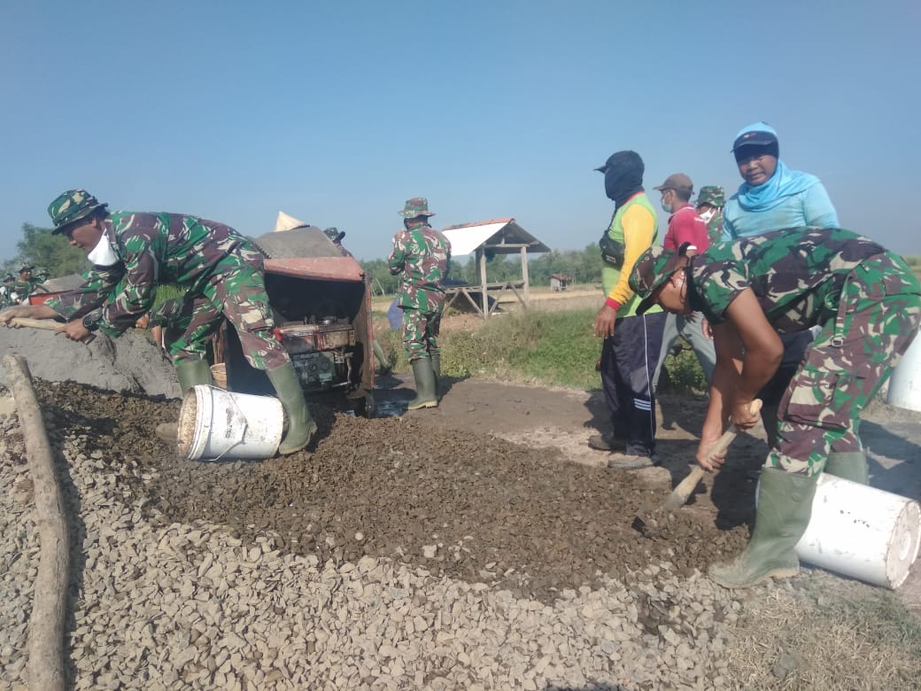 PATI – Seolah tidak mau kehilangan akal, anggota Satgas TNI Manunggal Membangun Desa (TMMD) Reguler Ke-111 Kodim 0718/Pati di Desa Tamansari ini menggunakan alat angkut pasir dan koral dari ember bekas cat.