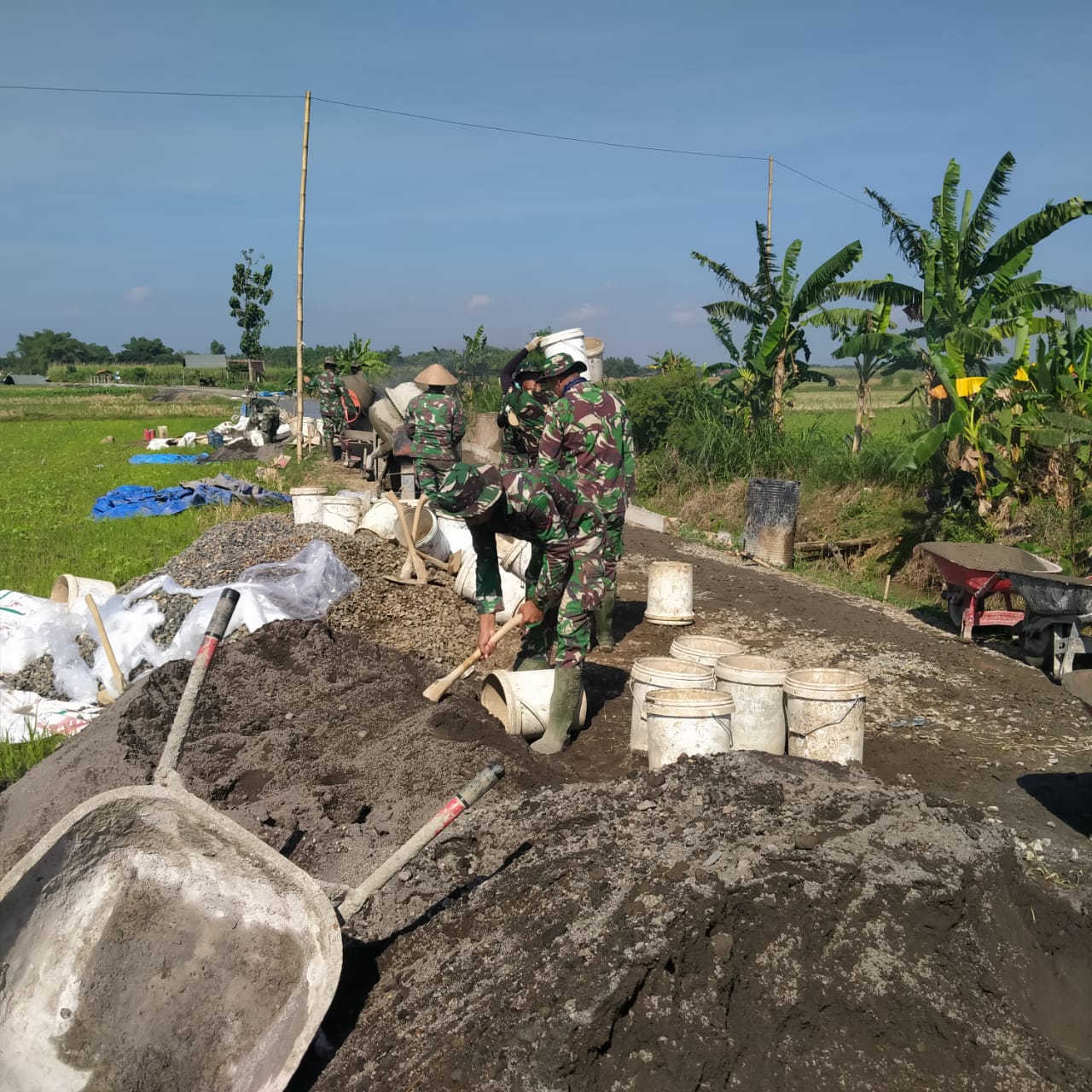 Pati- Anggota TNI yang tergabung dalam tim satuan tugas TMMD Ke 111 Kodim 0718/Pati bersama dengan warga bahu membahu dalam kegiatan program Betonisasi jalan desa area pertanian di Desa Tamansari Kecamatan jaken Kabupaten Pati. Selasa,(06/07/2021).