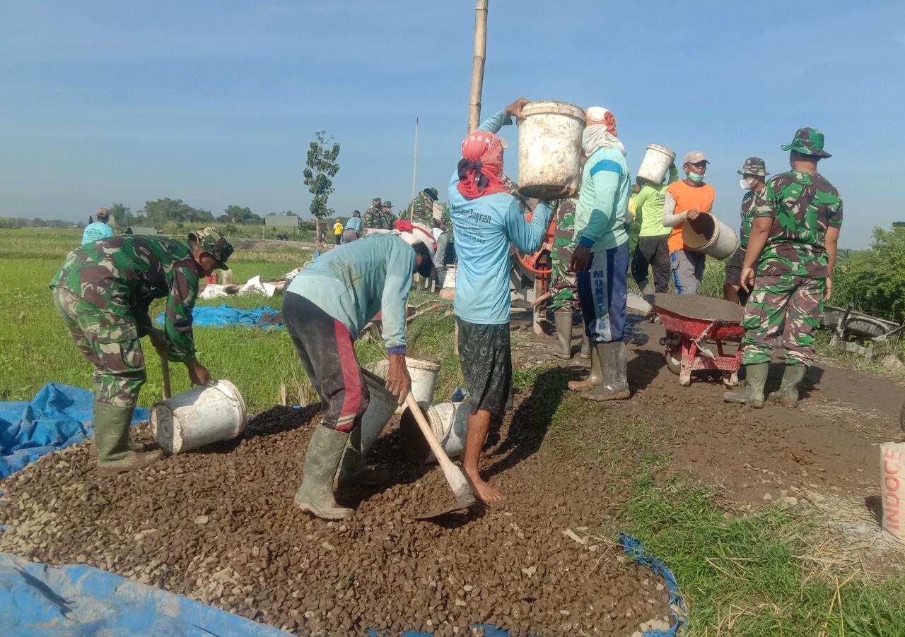 Pati- Setelah semalam diguyur hujan deras disekitar wilayah desa Tamansari, pagi tadi mulai cuaca cerah dan para anggota satgas bersama masyarakat melanjutkan gotong royong betonisasi jalan penghubung dua desa. Selasa,(29/06/2021).