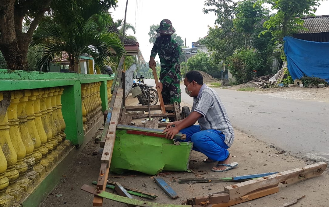Pati – Pagi itu terlihat Serda Sukarji anggota Satgas TMMD Reguler ke-111 Kodim 0718/Pati sedang membantu Bapak Yasmin (56) warga Dukuh Kemiri, Desa Tamansari Kecamatan Jaken, Kabupaten Pati, memperbaiki Gerobak yang biasa digunakan untuk mengangkut barang dagangannya yakni kayu bakar, Jum’at (09/7/2021).