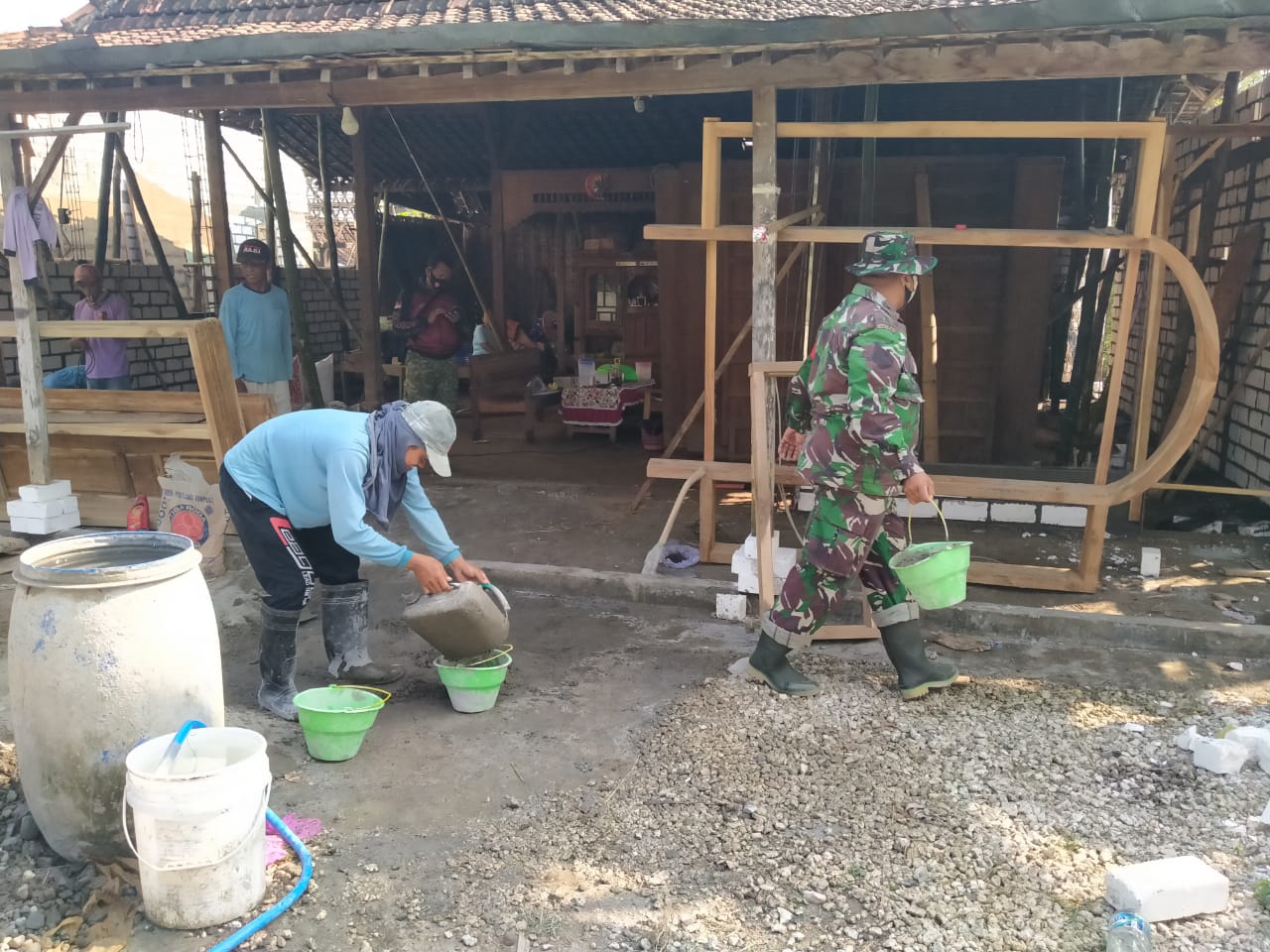 Terlihat anggota TNI yang tergabung dalam satgas Pra TMMD Ke 111 Kodim 0718/Pati dan warga masih berjibaku dengan tugasnya masing-masing, ada yang mengaduk semen, membawa Speci dan memasang dinding bata untuk rumah Santoso(55).