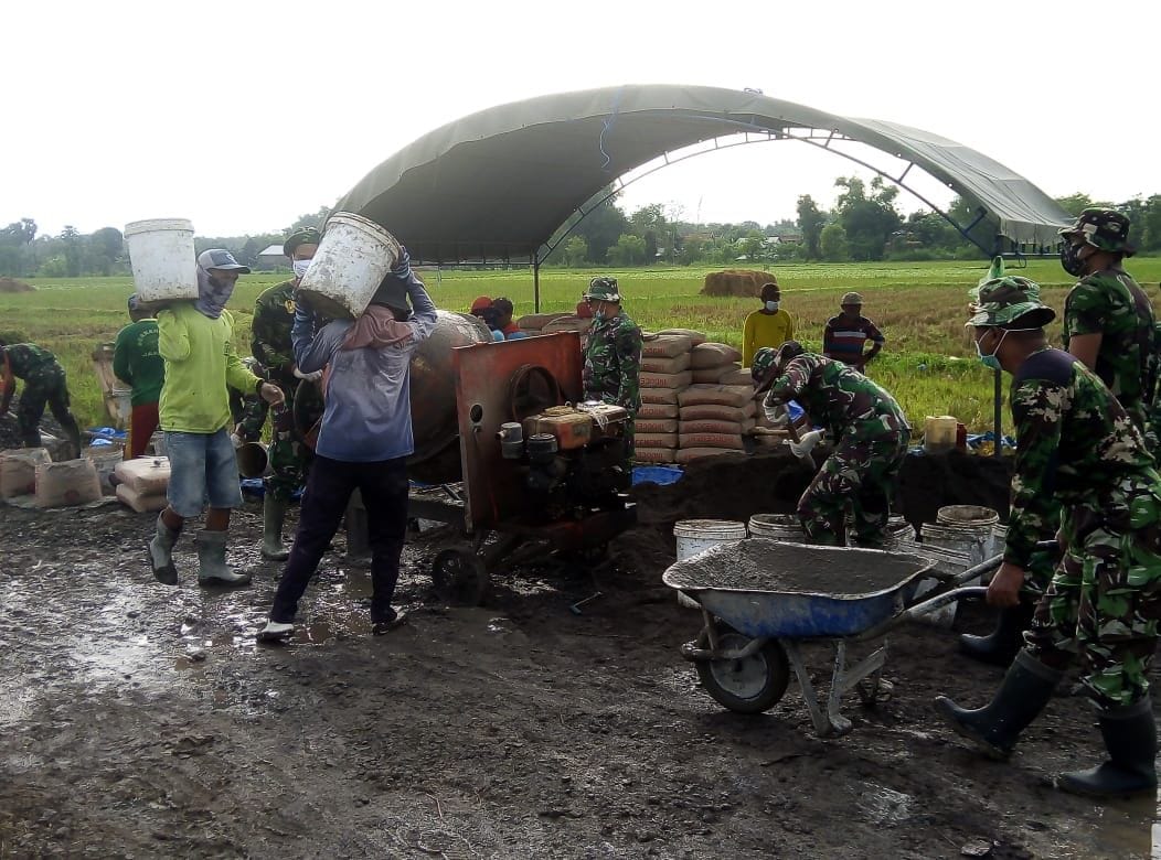 PATI – Warga masyarakat Desa Tamansari, Kecamatan Jaken, Kabupaten Pati, bersinergi dan bergotong royong bersama sama anggota Satgas Kodim 0718/Pati, mengangkut matarial batu split, semen dan pasir untuk di masukin ke dalam molen, pembuatan bahan cor sebelum dilakukan pengecoran jalan.