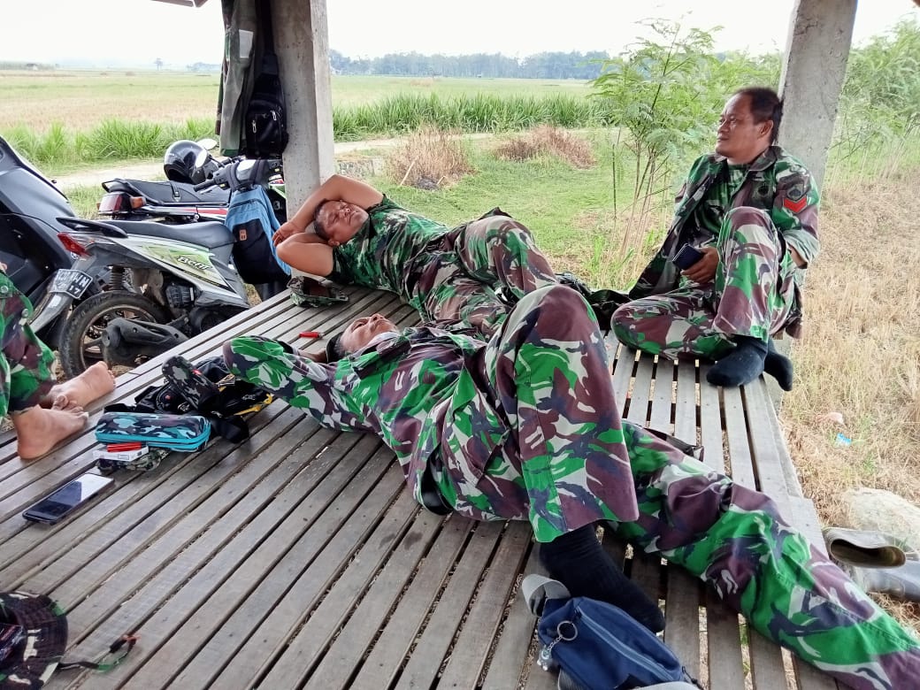 PATI – Demi suksesnya TMMD Reguler ke-111 Kodim 0718/Pati, di Desa Tamansari, Kecamatan Jaken, Kabupaten Pati, sejumlah anggota Satgas memanfaatkan waktu istirahat siang di gubuk warga, yang tidak jauh dari lokasi pekerjaan pengecoran jalan yang ada area persawahan.