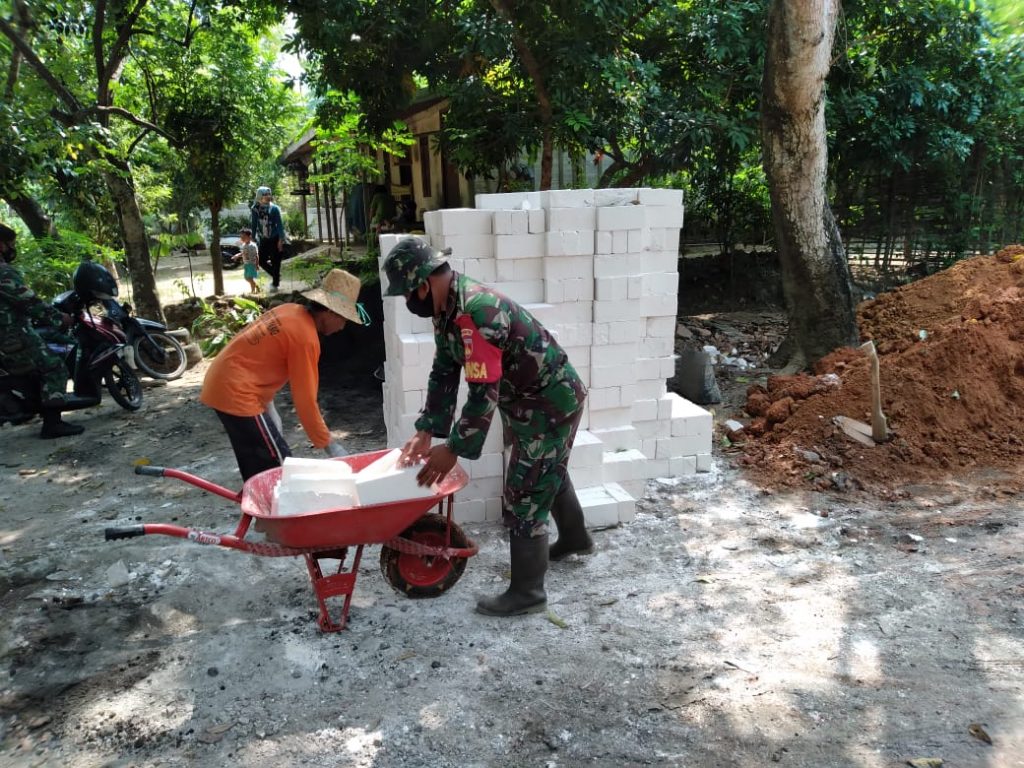 Agar pembangunan Rumah Tidak Layak Huni (RTLH) milik Sutinah(55) berjalan dengan baik, anggota TNI yang tergabung dalam tim RTLH, mulai mempersiapkan segala sesuatu yang dibutuhkan, diantaranya berupa material bata herbel yang diangkut menggunakan angkong agar lebih dekatdengan rumah yang akan direhab.