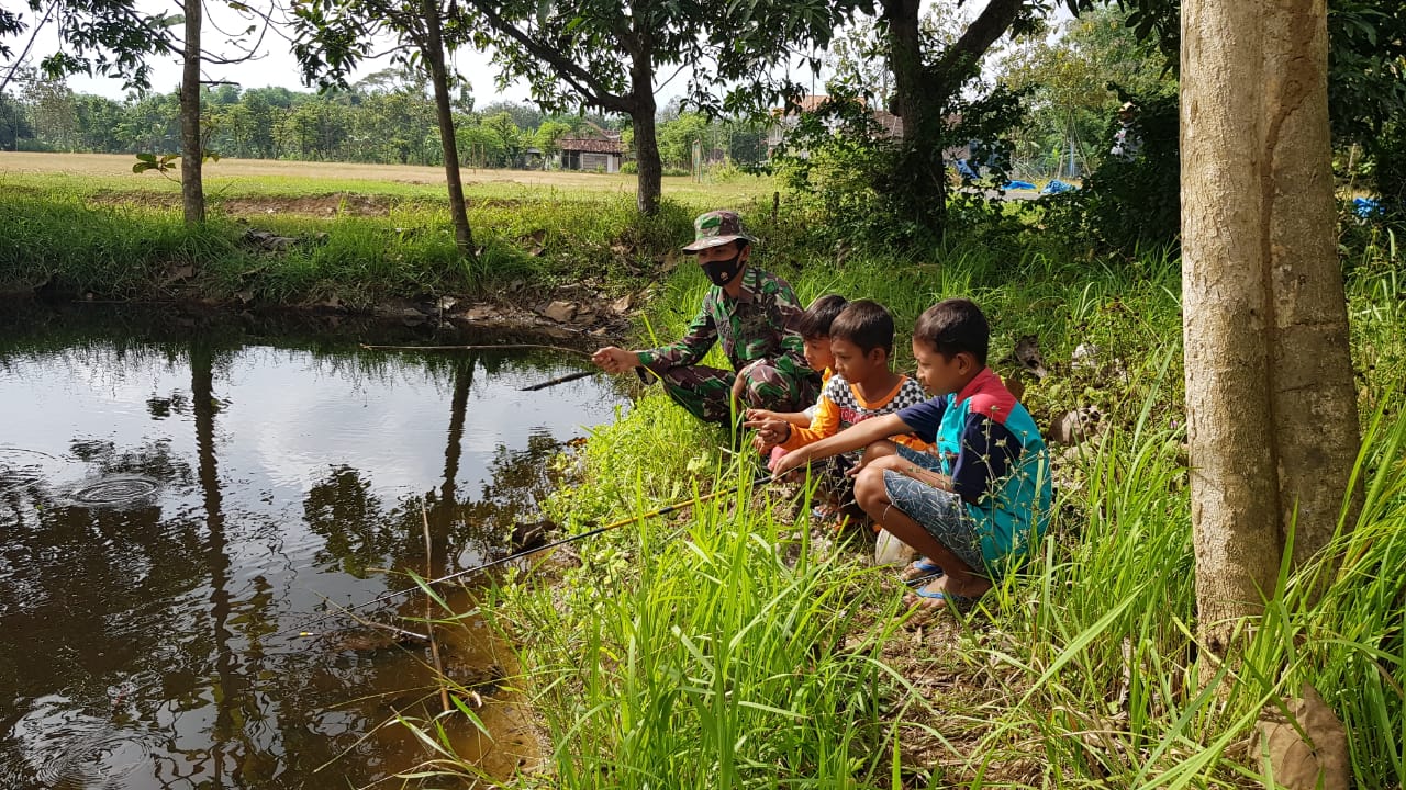 Pati – Sekedar menghilangkan penat dan jalin keakraban bersama anak-anak, Serda Sukarji anggota Satgas TMMD Reguler ke-111 Kodim Pati, mancing di sebuah embung yang berada tidak jauh dari lokasi sasaran fisik TMMD, selepas melakukan pekerjaan pembangunan pengecoran jalan di Desa Tamansari, Kecamatan Jaken, Kabupaten Pati.
