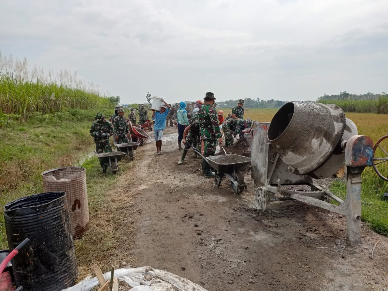 Pati- Jalan desa di Desa Tamansari Kecamatan Jaken Kabupaten Pati yang menjadi sasaran program kegiatan TNI manunggal Membangun Desa (TMMD) Reg-111 Kodim 0718/Pati terlihat begitu ramai.Minggu,(20/06/2021).