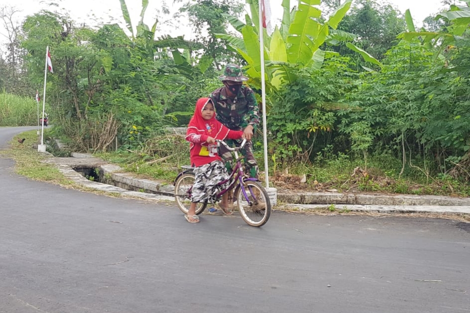 Dengan sedikit perasaan takut, anak yang masih duduk di bangku TK itu juga seneng dibantu pak tentara belajar naik sepeda onthel.
