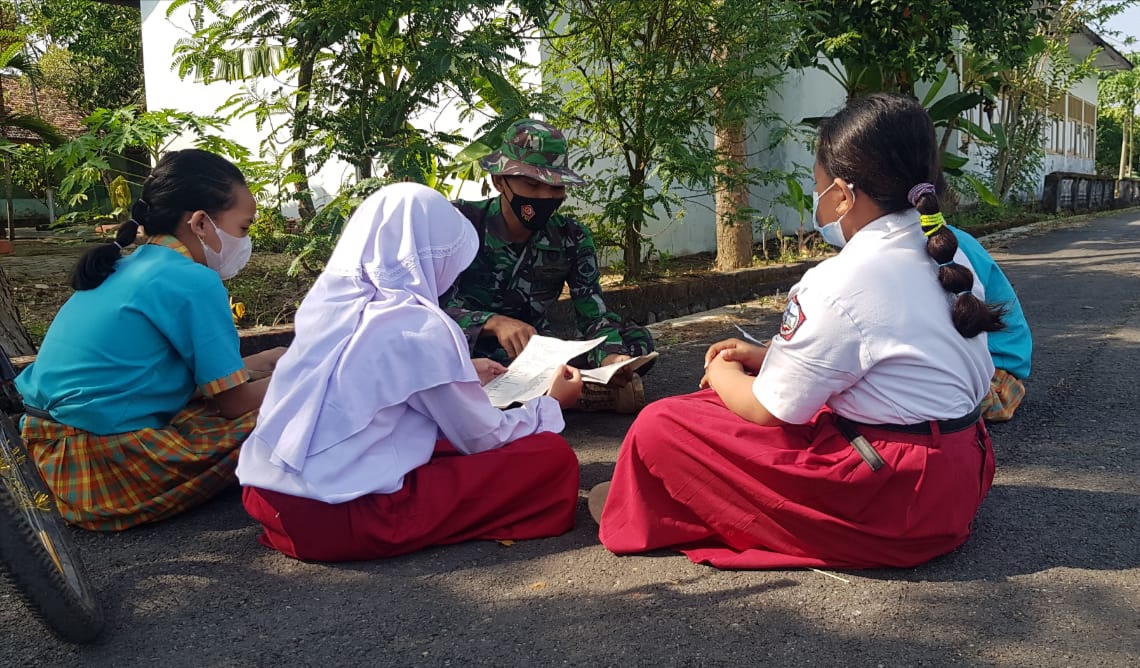 Pati – Untuk menjawab tantangan pandemi Covid-19, belajar tidak harus diruang sekolah, namun belajar bisa dilakukan di mana saja asal ada kemauan serta patuhi protokol kesehatan, seperti yang dilakukan Serda Sukarji anggota satgas TMMD Regular ke-111 Kodim 0718/Pati, Sabtu (12/6/2021).