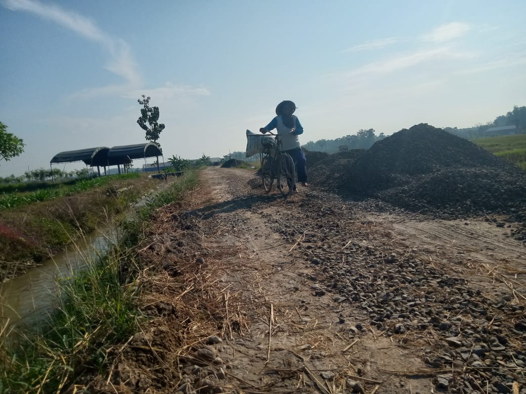 “Banyak batu pak apalagi material untuk pengecoran jalan banyak di jalan, saya nggak berani naik sepeda takut jatuh,”ungkap Sukarti saat melintas.Rabu,(16/06/2021).