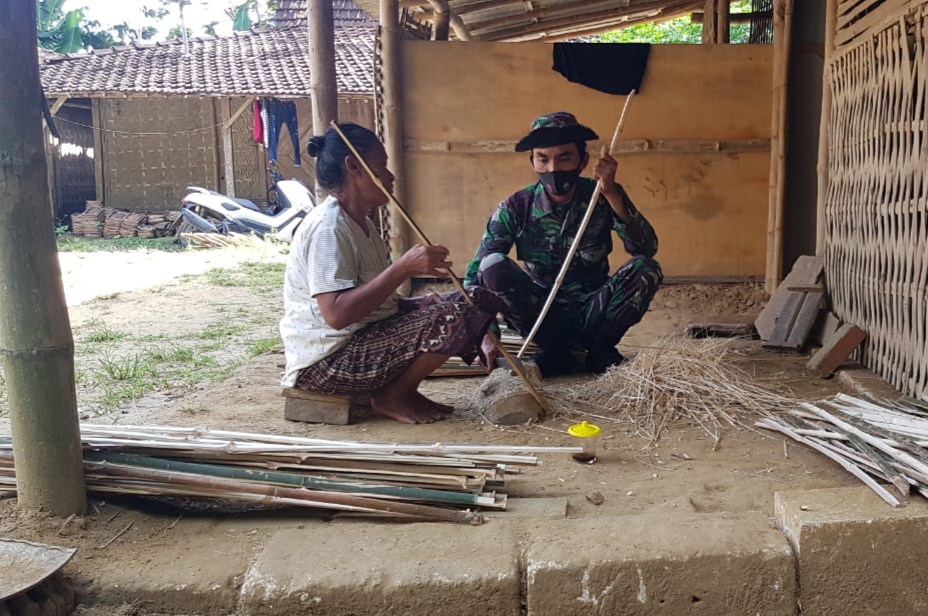 Pati – Serda Sukarji, disela-sela kesibukannya sebagai anggota Satgas TMMD Reguler ke-111 Kodim 0718/Pati, ia masih bisa meluangkan waktunya untuk membantu Mbah Juminah (64) warga Dukuh Pandahan RT.02/03, Desa Tamansari, Kecamatan Jaken, Kabupaten Pati, yang sedang membersikan ataupun menghaluskan bilah-bilah bambu untuk lanjaran kacang panjang di kebunnya. Karena saat kebun Mbah Juminah ditanami sayuran kacang panjang.