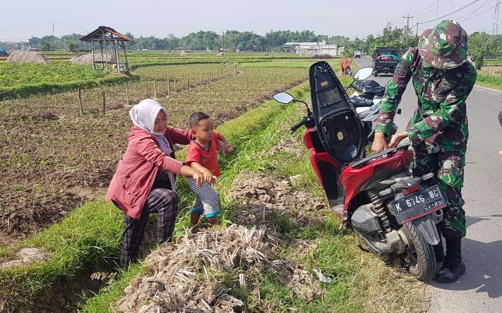 Terlihat Serda Sukarji sedang menuangkan bensin dari dalam kantong plastik ke tangki sepeda motor milik Endang (35) warga Dukuh Kemiri RT.03/01, Desa Tamansari, Kecamatan Jaken, yang kehabisan bensin saat akan pulang dari bekerja dari sawah miliknya.