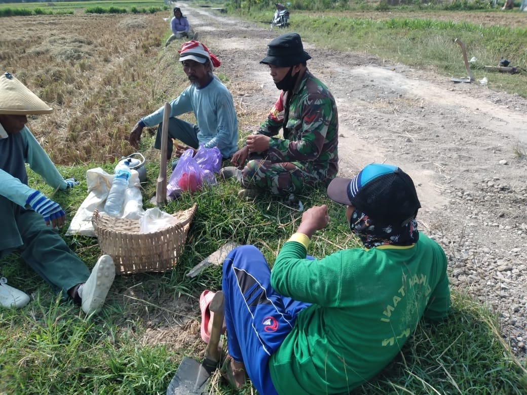 Dalam pekerjaannya satgas TMMD bersama warga telihat saling bersenda gurau, bahkan ketika disela istirahat pekerjaan saat menunggu datangnya tanah yang didrop oleh truck, sambil istirahat dilokasi mereka menikmati snack yang telah di antar Ibu bayan, Senin (14/06/2021).