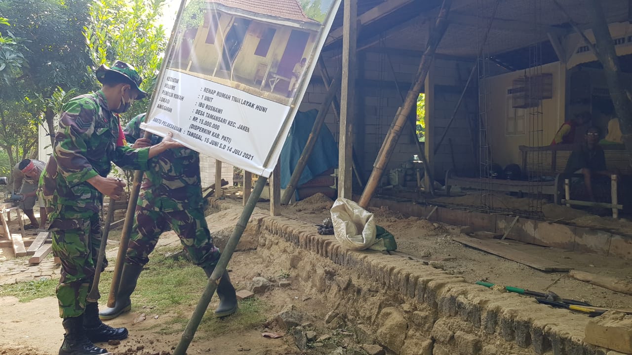 Pati-Menjelang pembukaan TMMD Reguler 111 Kodim Pati, Sejumlah anggota satgas TMMD bersama masyarakat terlihat sibuk memasang banner atau papan informasi yang berisikan info besar anggaran dan program tersebut.Minggu,(13/06/2021).