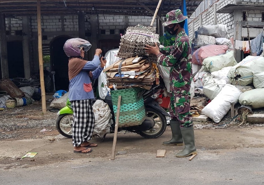 Serda Sukarji salah satu anggota Satgas TMMD Reguler ke-111 Kodim Pati yang meluangkan waktunya disela-sela kesibukannya untuk membantu Ibu Sukarni, warga Dukuh Kemiri RT.02/02, Desa Tamansari, Kecamatan Jaken, Kabupaten Pati, menurunkan barangnya dari atas sepeda motor. Ia berprofesi jual beli barang bekas atau biasa disebut rosok. Dalam artian dirinya membeli dari warga masyarakat dan di jual ke pengepul barang bekas, Rabu (30/6/2021).