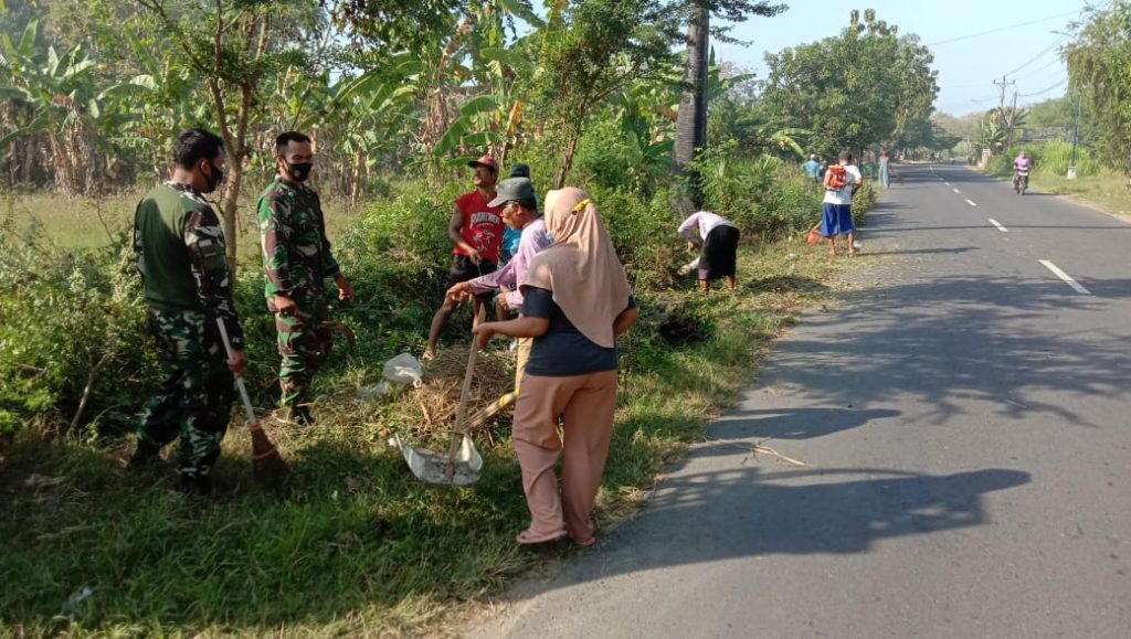 Pati – Personel TNI dari Satgas Pra TNI Manunggal Membangun Desa (TMMD) Ke-111 Kodim 0718/Pati bersama-sama Warga Dusun Pandahan RT02 RW02 melaksanakan kegiatan Jumat Bersih, gotong-royong membersihkan seputaran lingkungan di Desa Tamansari, Kecamatan Jaken, Kabupaten Pati, Jumat (4/6/2021).