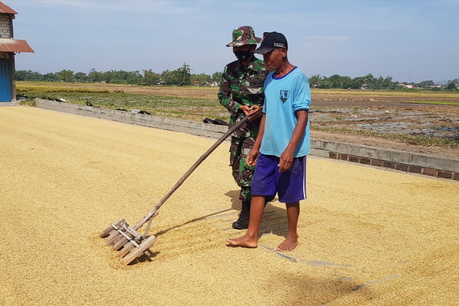 Karsono Menjemur Padi Hasil Panen Dibantu Anggota Satgas