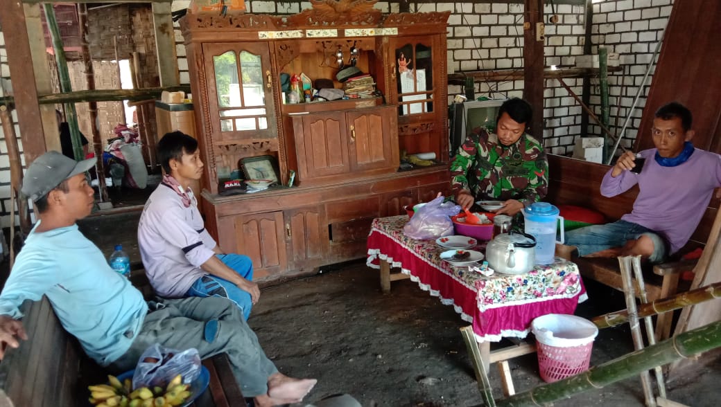 Pati – Anggota Satgas TNI Manunggal Membangun Desa (TMMD) 111 Kodim 0718/Pati kopda Bowo melaksanakan Komunikasi Sosial (Komsos) disela-sela waktu istirahat rehab RTLH di rumah Santoso (55) Dusun Pandahan Desa Tamansari, Kecamatan Jaken, dalam rangka pembinaan teritorial (Binter) dengan warga dilokasi TMMD 111, senin (14/6/2021).