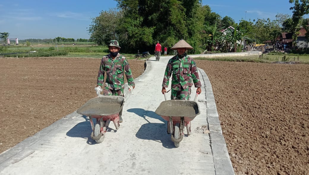 Sertu Priyanto dan Serda Ahmad tergabung dalam Satgas TMMD Reguler Ke-111, dengan begitu kokoh dalam memegang gagang angkong dan lengan yang kuat selalu mondar mandir mengangkut dan mendorong adonan cor beton di lokasi rabat beton jalan.