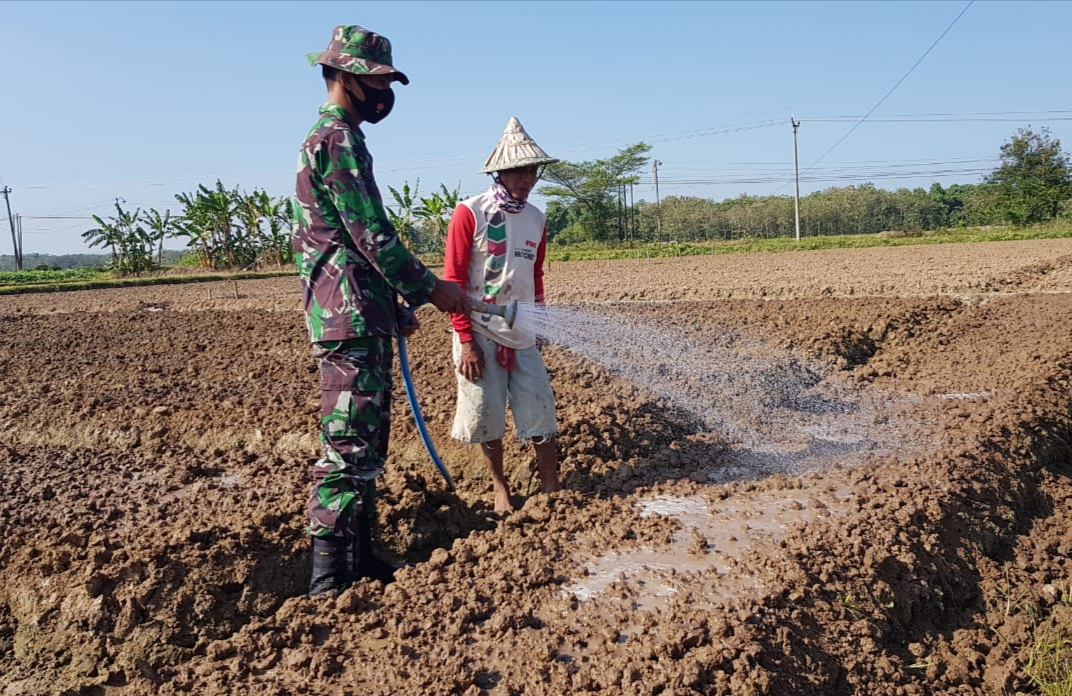 Kali ini Serda Sukarji sedang menyambangi kebun milik Bapak Samijo (58) warga Dukuh Kalimati, Desa Tamansari, Kecamatan Jaken, Kabupaten Pati, sembari membantu menyemprotkan air ke media tanam untuk bibit bawang merah, Selasa (06/7/2021)