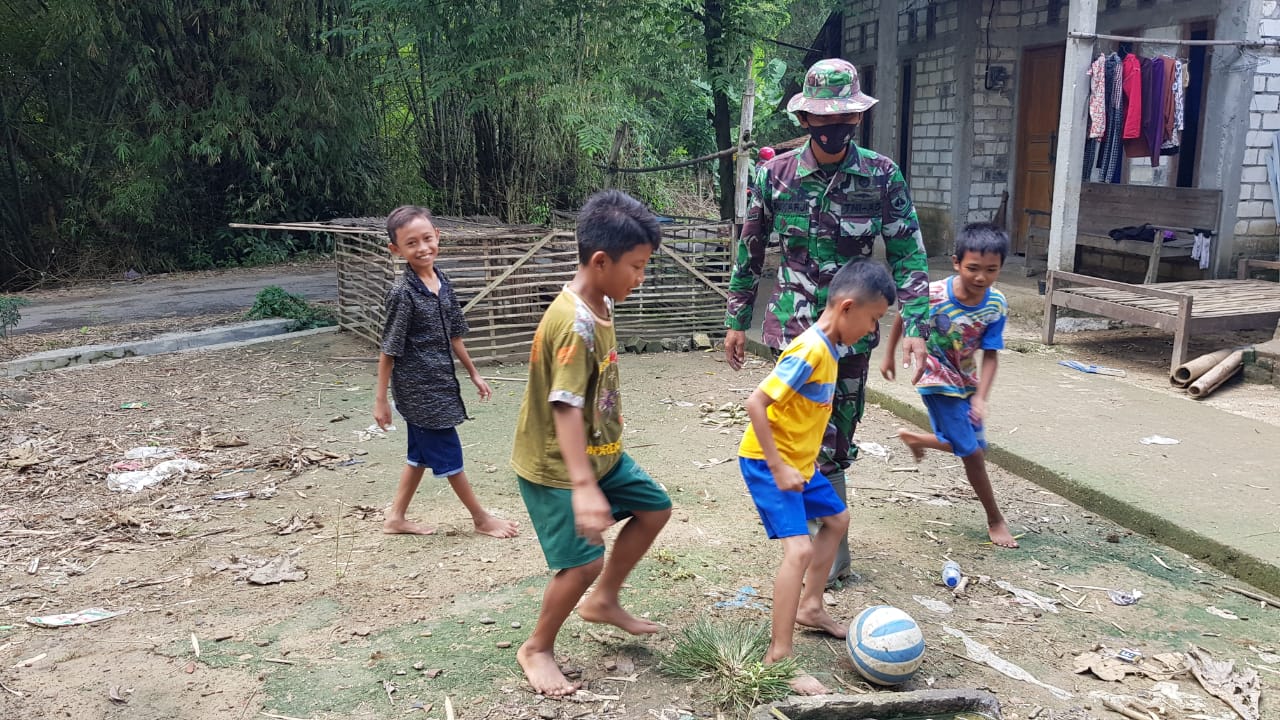 Pati – Seiring waktu berjalannya TMMD reguler ke 111 Kodim Pati, warga desa Tamansari, Kecamatan Jaken sudah sangat akrab kesehariannya dengan anggota satgas TMMD. Begitu juga dengan anak-anak didesa tersebut ketika mereka bermain bola kadang mereka mengajak anggota satgas turut ikut.