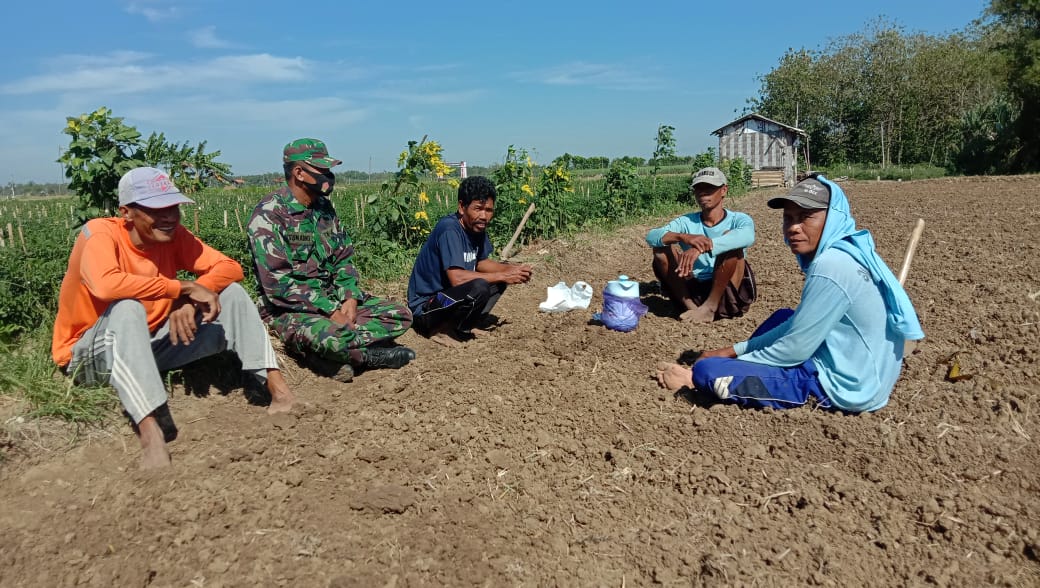 Sertu Sumarno, anggota Satgas TMMD Reguler 111, saat istirahat siang tadi di dekat lokasi sasaran utama rabat beton melaksanakan komunikasi sosial (komsos) dengan seorang petani yang sedang menggarap lahan sawah yang akan ditanami bawang merah. Dalam kesempatan tersebut Sertu Sumarno menanyakan cara menanam bawang merah disaat musim kemarau, yang juga banyak ditanam di area persawahan desa Tamansari kecamatan Jaken.