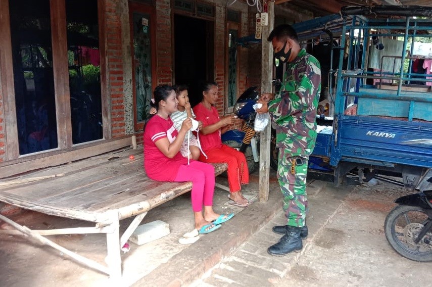 Sertu Sumarno, memberikan masker kepada warga dan mengedukasi tentang protokol kesehatan