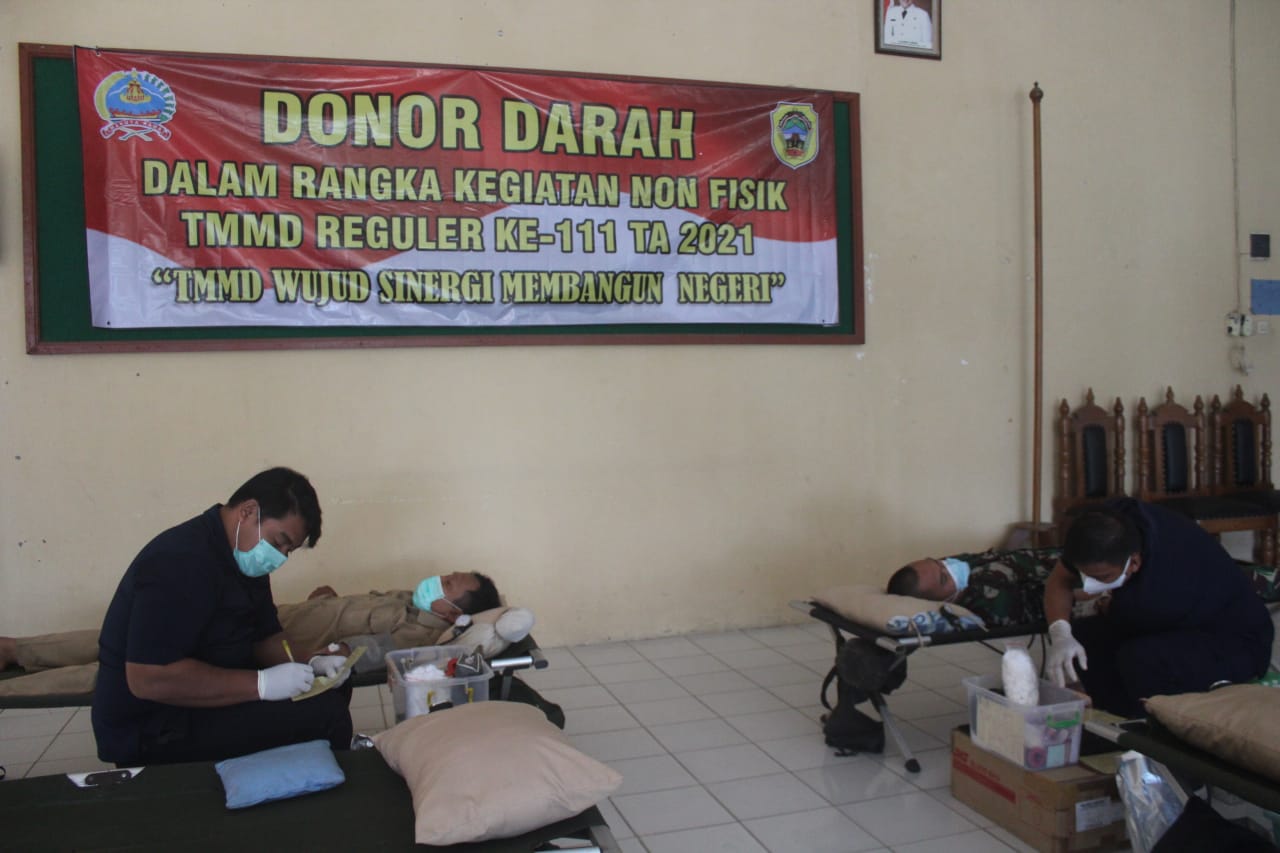 Dalam kegiatan sosial dalam rangka TMMD reguler 111 tersebut diselenggarakan kegiatan donor darah yang diikuti oleh TNI,Polri,PNS serta para seukarelawan untuk memenuhi stok darah PMI Pati dalam masa pandemi Covid-19.