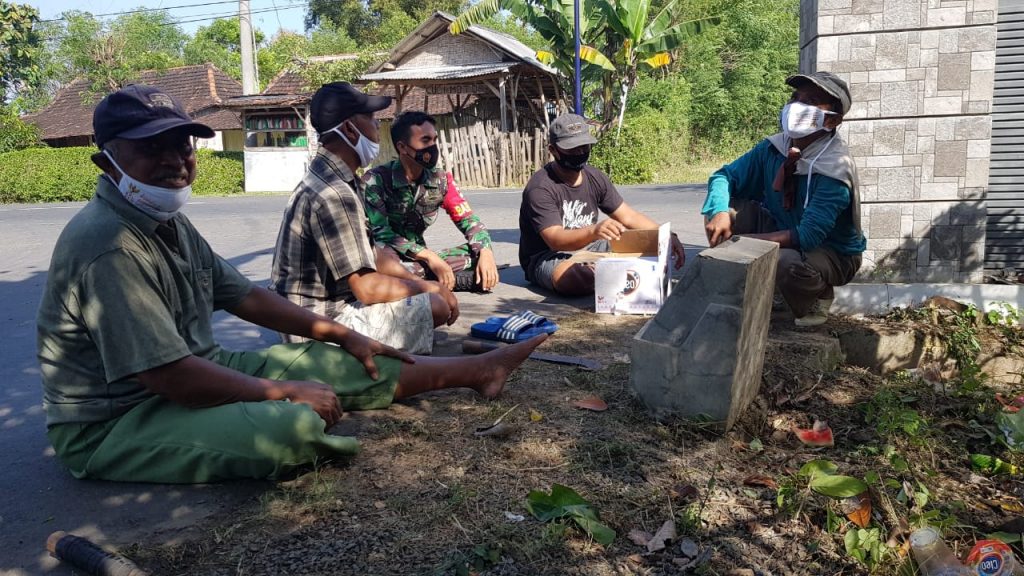 Pati – Pelaksanaan TMMD Reguler ke-111 Kodim Pati secara ketat mengedepankan protokol kesehatan. Pasalnya hingga bulan Juni 2021 masa pandemi Covid-19 secara umum belum berakhir. Tampak beberapa warga yang sedang beristirahat bersama salah satu anggota Satgas TMMD Serda Sukarji, mereka tetap menggunakan masker dan menjaga jarak aman saat bekerumun, Jum’at (04/6/2021)