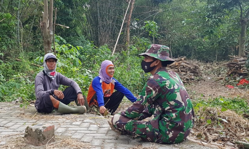 Seperti terlihat saat ini Suparjo bersama temannya ketika bertemu dengan Serda Sukarji anggota Satgas TMMD Reguler ke-111 Kodim Pati. Disebelah mereka ada dua tumpukan kayu bakar yang sudah siap angkut, Kamis (17/6/2021)