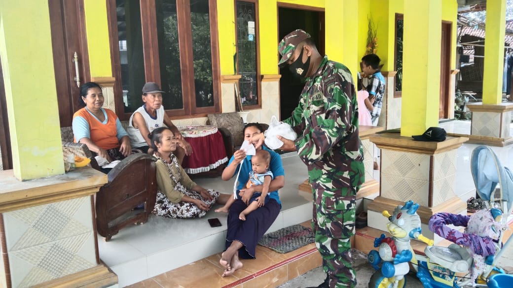 Sertu Sumarno, memberikan masker kepada warga dan memberikan edukasi tentang protokol kesehatan 5M (Memakai masker, Mencuci tangan dengan air mengalir, Menjaga jarak, Menjauhi kerumunan dan Mengurangi mobilitas), kegiatan tesebut merupakan salah satu upaya TNI dalam membantu pemerintah mencegah penyebaran Covid 19 yang saat ini kasusnya sedang meningkat.