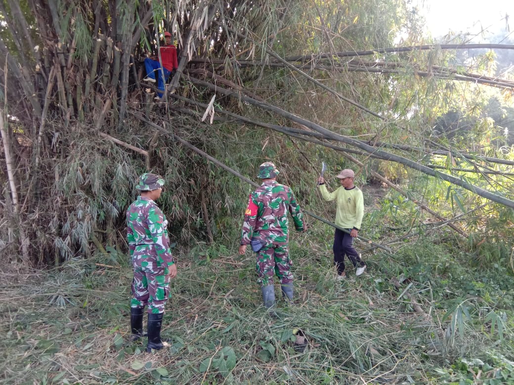 Terlihat bersama masyarakat yang ada di Dukuh Kemiri Desa Tamansari, Kecamatan Jaken, Kabupaten Pati yang dengan penuh semangat bersama dengan beberapa personel TNI memotong pohon bambu yang akan digunakan sebagai sarana pendukung pembangunan rumah warga, Minggu (06/6/2021).
