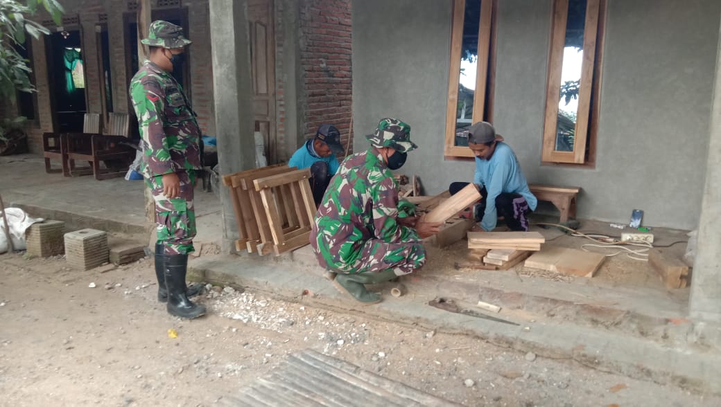 Pati – Proses pembangunan Rumah Tidak Layak Huni (RTLH) yang sudah berjalan dikerjakan Satuan Tugas TNI Manunggal Membangun Desa (Satgas TMMD) Reguler Ke-111 Kodim 0718/Pati, setelah rampung mengerjakan pembongkaran, pemasangan bata putih, plesteran dan acian, kini rumah milik Siti Zulaikah (42) sedang dikerjakan pemasangan ventilasi pintu dan jendela yang terbuat dari kayu, Senin (28/6/2021).