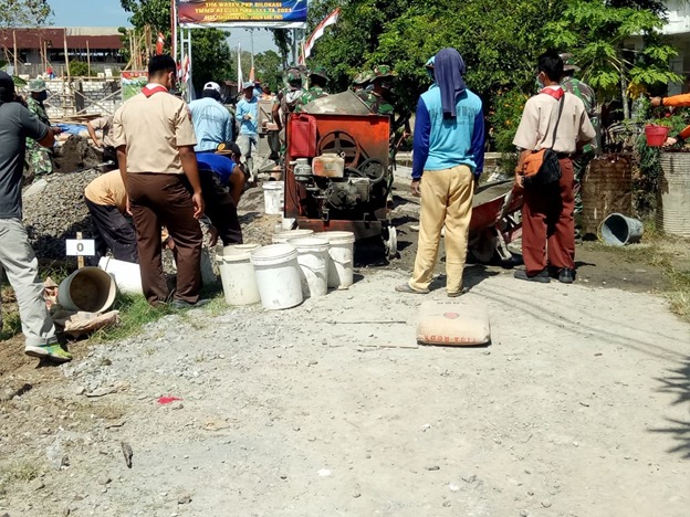 Tampak terlihat Anggota Pramuka (perwakilan Pramuka Kwarcab Pati) ikut bergabung dalam pengecoran jalan di desa Tamansari. Mereka bersama-sama Satgas TMMD dan warga bekerja untuk menyelesaikan pengecoran jalan sepanjang 1400 meter yang menghubungkan Desa Tamansari ke desa Sumberarum.