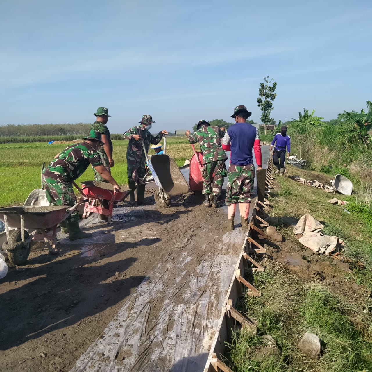 Anggota TNI dari Kodim 0718/pati ini seolah tidak ragu dengan apa yang dia kerjakan. Tanpa pikir panjang diambilnya gerobak beroda satu atau sering disebut dengan angkong itu merapat ke molen untuk pengambilan adukan.