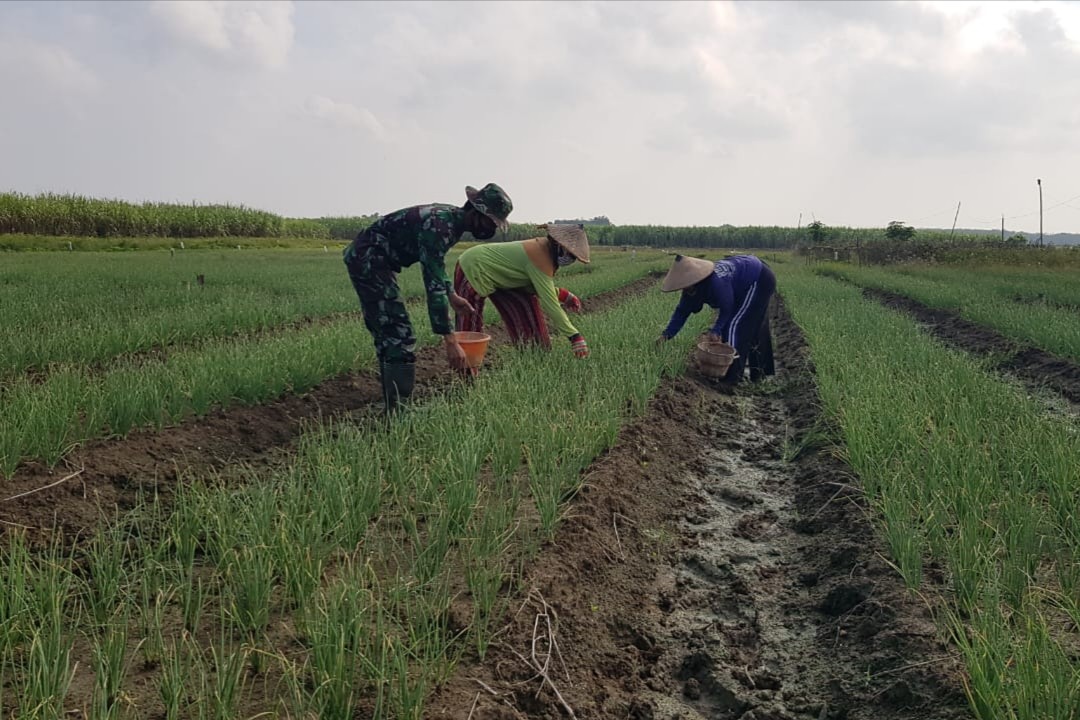Serda Sukarji anggota Satgas TMMD Reguler ke-111 Kodim 0718/Pati yang ikut membantu Sukatmi (46) dan Jumiati (38) warga setempat dalam bekerja membersihkan daun bawang kering. Mereka terlihat akrab sembari berbincang-bincang terkait pengalaman menjadi buruh tani yang merawat tanaman bawang merah, Kamis (01/7/2021).