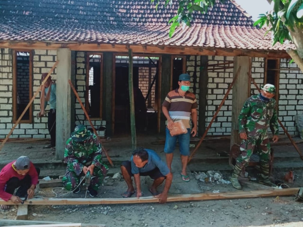 Pati- Rehab rumah milik Santoso Rt.02/02 hingga hari ini mencapai 60 % terlihat semua dinding rumah telah berdiri dan para anggota satgas bersama masyarakat mempersiapkan kayu yang akan dipasang sebagai blandar penyangga bagian belakang rumah. Sabtu,(19/06/2021).