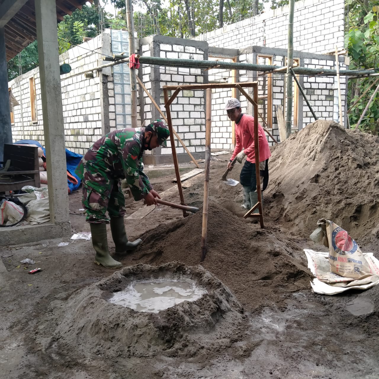 ini terlihat ketika anggota TNI dan warga sedang berkolaborasi membuat adukan semen untuk pembangunan rumah RTLH milik Asmuri(50).