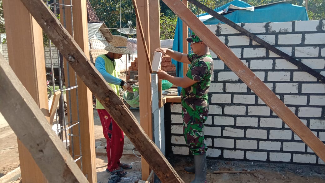 Tampak Koptu Suprianto, anggota Satgas TMMD yang memiliki skill khusus bangunan, sedang membantu tukang profesi warga setempat, untuk memasang dinding batako rumah milik Asmuri (48), warga Dusun Kalimati RT 01, RW. 01, Taamansari, salah satu dari 16 penerima rehab rumah program TMMD dari Kodim Pati.