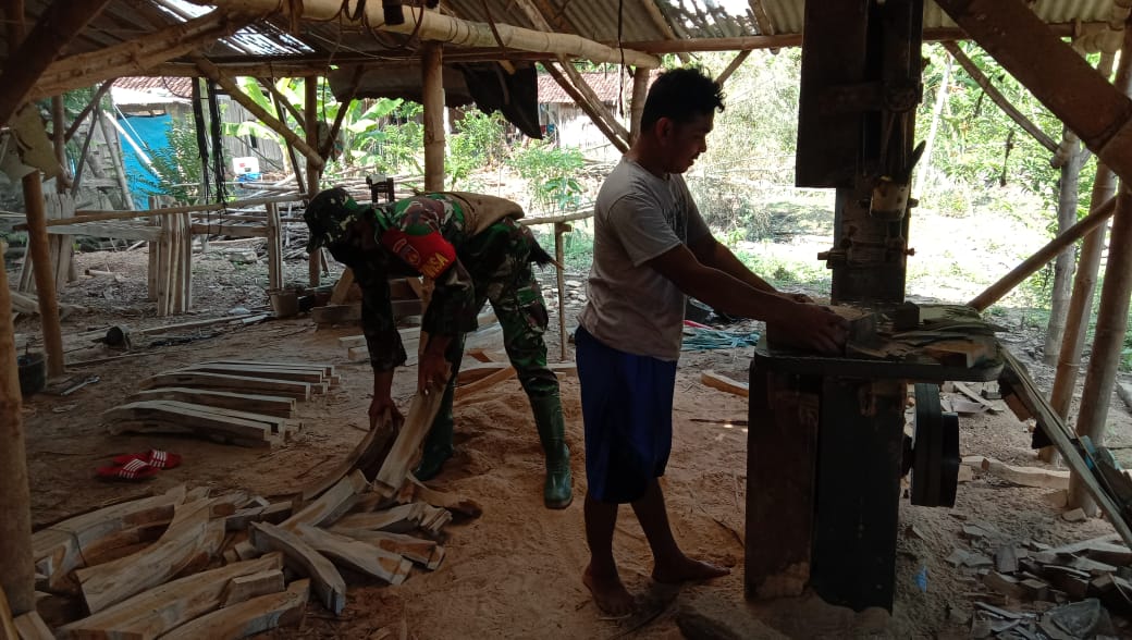 Seperti yang dilakukan Serda Warso manakala istirahat lepas pengerjaan perehaban rumah ia melakukan komunikasi sosial, di rumah Mustofa (41) pengrajin mebel di Desa Tamansari yang sudah terkenal. Senin (14/06/2021).