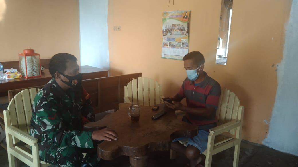 Serda Jamroni menyambangi Ketua Rt 02 Ali Sapuan (52) Desa Tamansari. Turut hadir warga setempat untuk saling berbincang mengajak Ketua Rt dan tokoh masyarakat untuk sama-sama peduli terhadap Program TMMD Reguler Ke – 111 Tahun 2021 di Kodim 0718/Pati. Senin (07/06/2021).