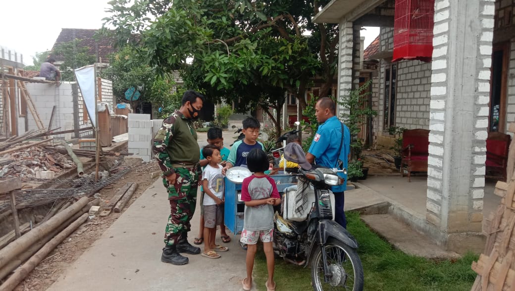 Termasuk Kopda Bowo, kali ini Komsos di depan halaman rumah warga, kebetulan ada pedagang makanan kecil (kojek penthol). Tampak perbincangan diiringi tawa riang dengan anak-anak. Disamping itu juga menyampaikan himbauan tentang Protokol Kesehatan (Prokes). (15/06/2021)