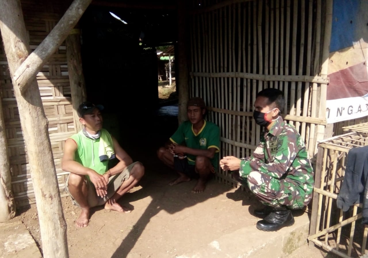 Pati – Pagi – pagi sebelum berangkat kerja ke lokasi sasaran fisik TMMD, Serda Sukarji salah satu anggota Satgas menyempatkan mampir dulu ke rumah Darmono (30) warga Dukuh Pandahan RT.03/03 Desa Tamansari, Kecamatan Jaken, Kabupaten Pati, sembari melihat-lihat koleksi ayam bangkoknya, Sabtu (19/6/2021).