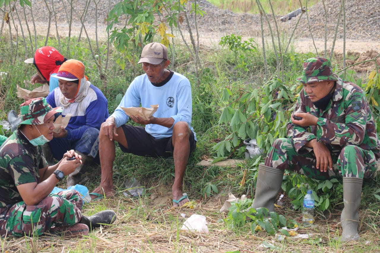 Terlihat pagi ini anggota TNI satuan tugas TMMD dan warga sedang menikmati sarapan pagi, nasi bungkus dengan kopi hitamnya yang dibungkus plastik, mereka tampak bersama-sama menyantap makanan dan minumannya dengan duduk diatas lantai tanah beralaskan rerumputan dipinggir jalan yang dilaksanakan betonisasi.