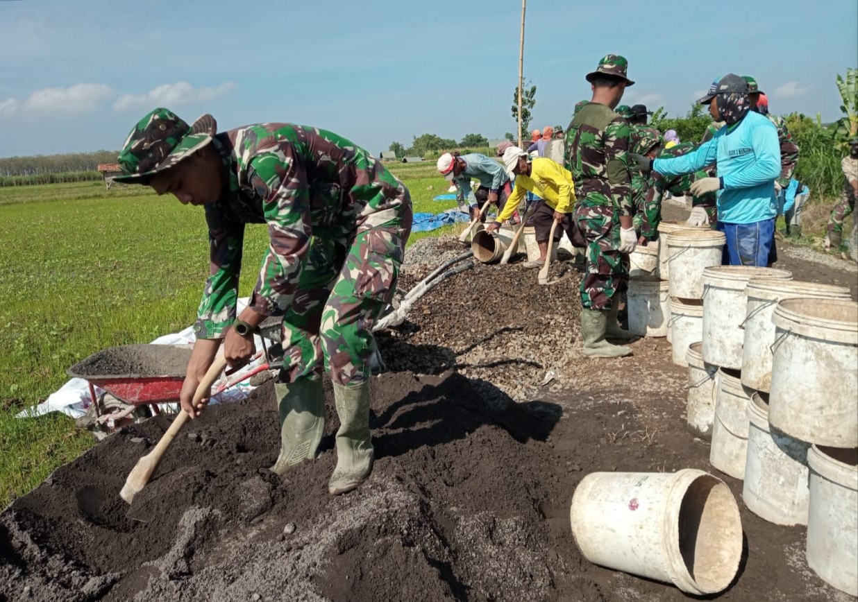 Kopral Slamet, pria kelahiran Randublatung Blora ini terlihat paling aktif dilokasi pengecoran jalan pertanian yang merupakan sasaran fisik TMMD. Dirinya selalu dihadapkan dengan tumpukan material pasir untuk di masukkan ke dalam ember untuk dilangsir ke mesin molen bersama batu koral dan semen, Kamis (01/7/2021).