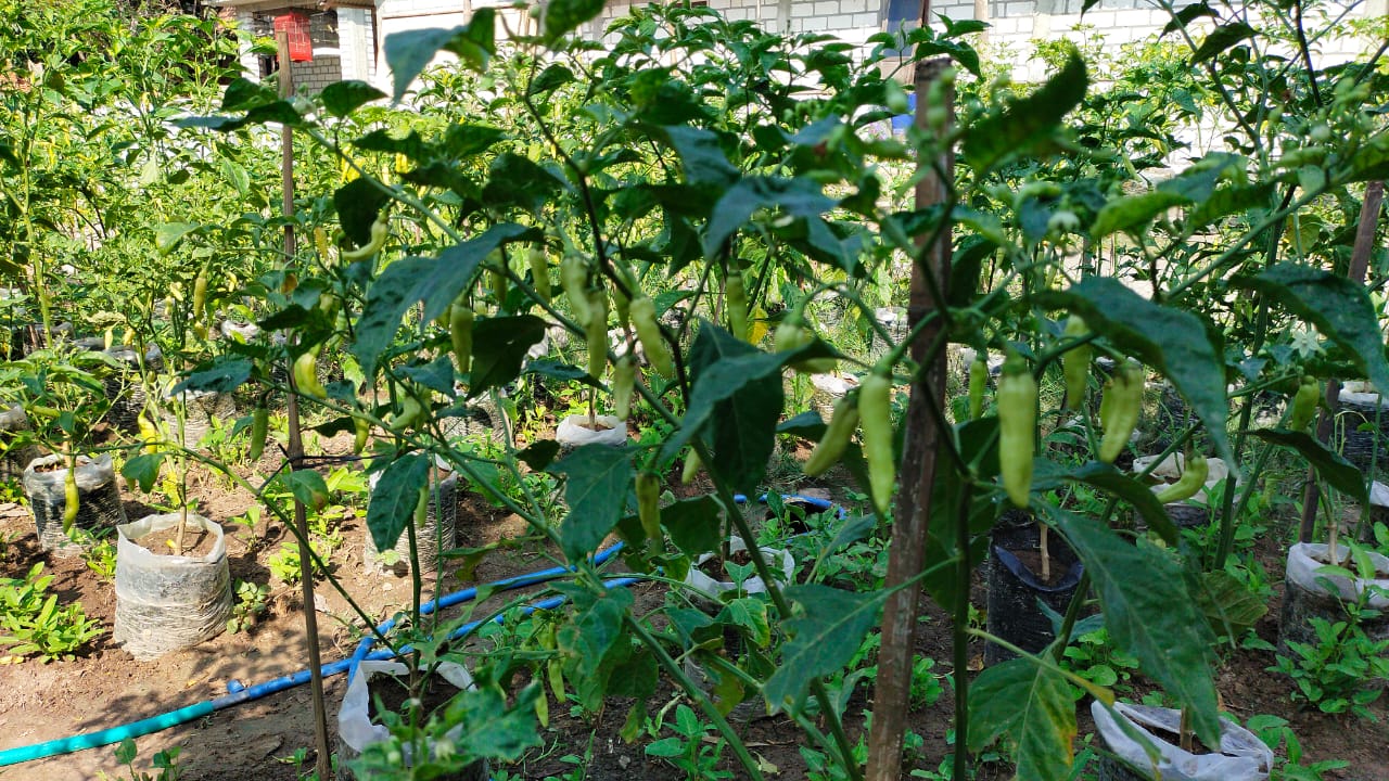Dengan memanfaatkan lahan yang terbatas ia menanam tanaman cabe didepan rumahnya yang sedang direhab oleh satgas TMMD Kodim Pati. Dengan media tanam polybag terlihat tanaman cabe yang ia tanam dapat tumbuh subur dan sebentar lagi dapat dipanen.